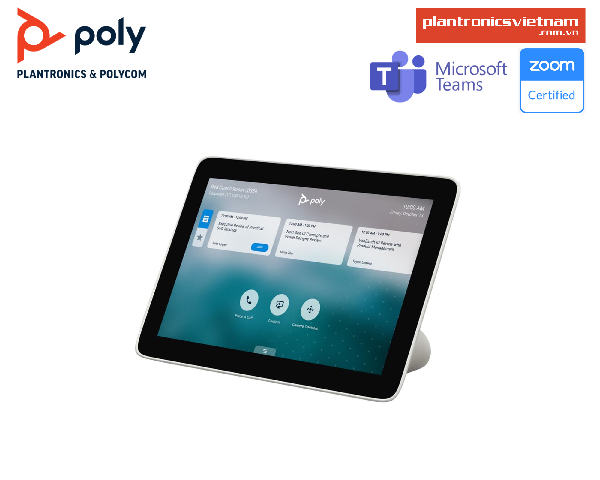 Poly TC8 là máy tính bảng màn hình cảm ứng 8″ được Poly thiết kế để làm phương tiện hội nghị truyền hình cho bạn. Nó cho phép bạn dễ dàng tương tác với hệ thống hội nghị truyền hình Poly Studio X30 và X50. Trực quan và dễ sử dụng, nó cho phép bạn dễ dàng quản lý điều khiển từ xa của mình , hội nghị trực tiếp bằng cách sử dụng danh bạ được nhập vào máy tính bảng và không cần phải sử dụng PC, Mac hoặc điện thoại thông minh để bắt đầu cuộc trò chuyện. Việc cài đặt rất dễ dàng. Chỉ cần kết nối nó với thanh hội nghị truyền hình bằng cáp RJ45 (được cung cấp). Sau đó, nhập tài khoản của bạn và bắt đầu hội nghị video của bạn. Trang nhã, trang nhã, phù hợp thời gian và hoàn toàn có thể đọc được nhờ màn hình lớn, nó sẽ tìm thấy vị trí của mình mà không gặp vấn đề gì trong một trong các phòng họp của bạn.